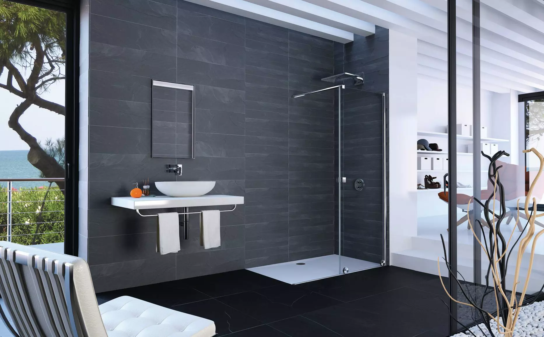 Wenn weniger mehr ist: Die HÜPPE Xtensa verzichtet weitestgehend auf Metallkomponenten und bringt die Glasflächen noch mehr zur Geltung. Dank spezieller Konstruktion kommt die Xtensa komplett ohne obere Führungsschiene der Gleittüren aus.